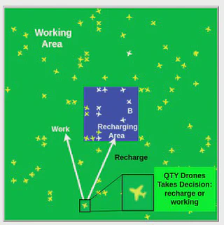 The low battery autonomy of Unnamed Aerial Vehicles (UAVs or drones) can make smart farming (precision agriculture), disaster recovery, and the fighting against dengue vector applications difficult. This article considers two approaches, first enumerating the characteristics observed in these three IoT application types and then modeling an UAV’s battery recharge coordination using the Agent-Based Simulation (ABS) approach. In this way, we propose that each drone inside the swarm does not communicate concerning this recharge coordination decision, reducing energy usage and permitting remote usage. A total of 6000 simulations were run to evaluate how two proposed policies, the BaseLine (BL) and ChargerThershold (CT) coordination recharging policy, behave in 30 situations regarding how each simulation sets conclude the simulation runs and how much time they work until recharging results. CT policy shows more reliable results in extreme system usage. This work conclusion presents the potential of these three IoT applications to achieve their perpetual service without communication between drones and ground stations. This work can be a baseline for future policies and simulation parameter enhancements.